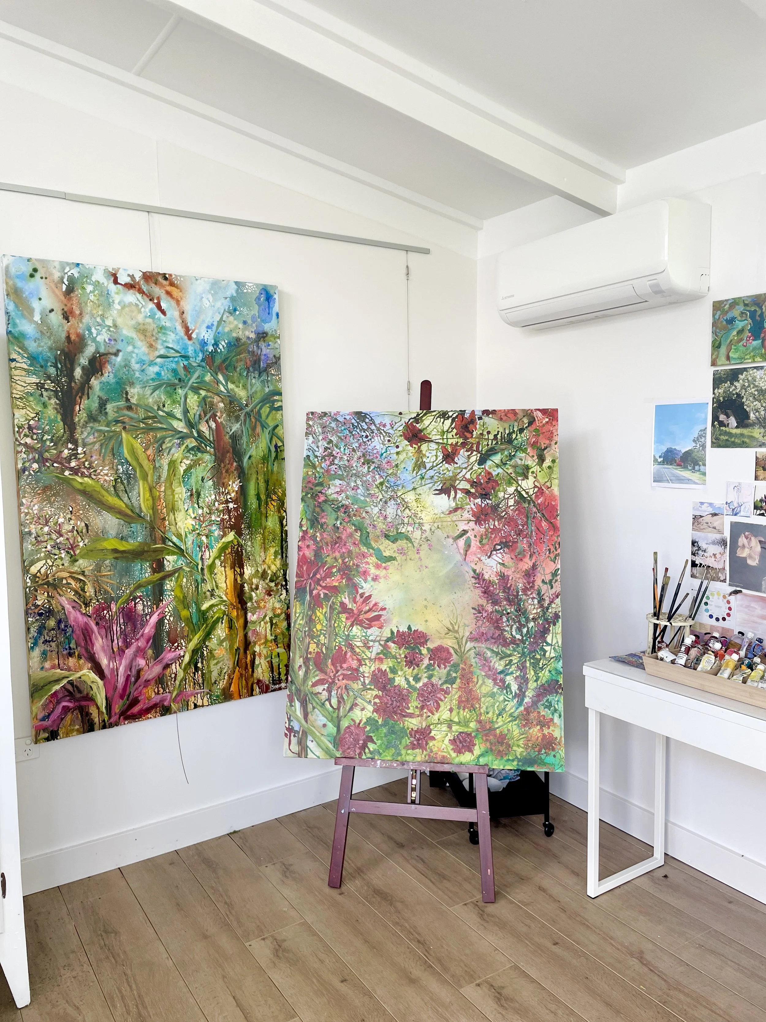 My home studio and therapy space are in the beautiful rolling hills of Witta, just near Maleny on the Sunshine Coast Hinterland. Studio visits most welcome by appointment. My other big project at the moment is creating my dream garden along with my husband Steve and in the future we hope to open this space up to be shared and enjoyed alongside my studio. You can also view my art at The Joy Collective in Maleny, Cooroy Butter Factory Gallery, Facebook and Instagram. I sell my art online and can arrange postage if you are unable to visit in person.